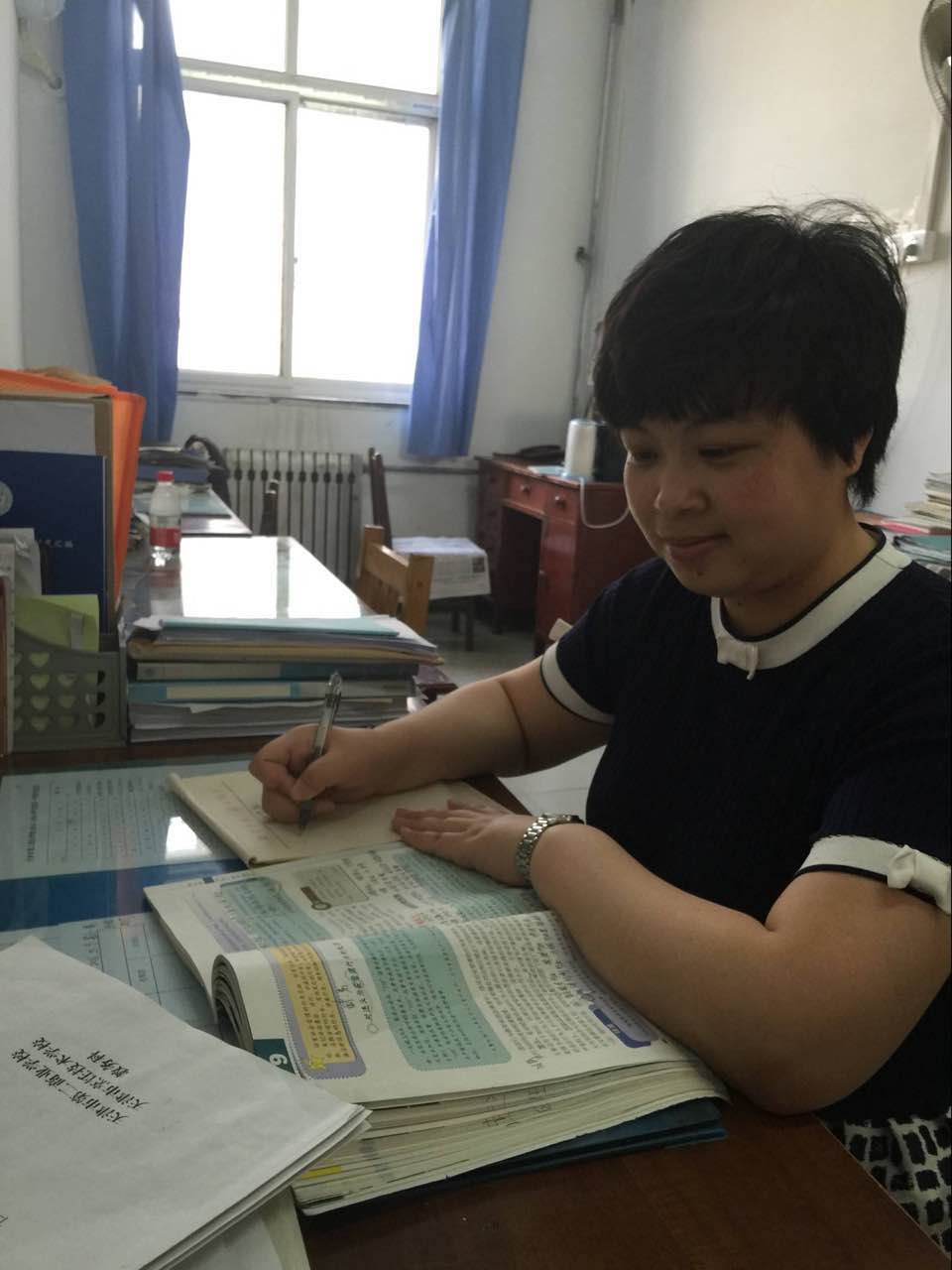 “欲影正者端其表,欲下廉者先其身”。作為一名基層黨支部書記,她深刻地體會到一名黨務(wù)工作者的一言一行在群眾眼中是何等重要;作為一名教師,她深知自己的一言一行又會對學(xué)生產(chǎn)生怎樣的影響。她曾說過:“我要對自己高標(biāo)準(zhǔn),嚴(yán)要求,不干則已,干就干好”。支部工作中,她認(rèn)真貫徹落實(shí)黨的路線方針政策和上級黨組織的決議決定,以日常教育教學(xué)工作促黨建,以提高隊(duì)伍素質(zhì)為重點(diǎn),以強(qiáng)化管理為手段,抓好思想政治工作,加強(qiáng)自身的道德品質(zhì)修養(yǎng),努力發(fā)揮好共產(chǎn)黨員先鋒模范的作用。除了支部書記和教研室主任工作以外,她每周還承擔(dān)著20多節(jié)德育課的教學(xué)任務(wù),面對如此繁重的工作,她從不抱怨,更從不耽誤,均能按時(shí)按質(zhì)完成各項(xiàng)工作。她家住塘沽,每天上下班路途遙遠(yuǎn),但她從不搞特殊,嚴(yán)格按照學(xué)校各項(xiàng)規(guī)章制度辦事。