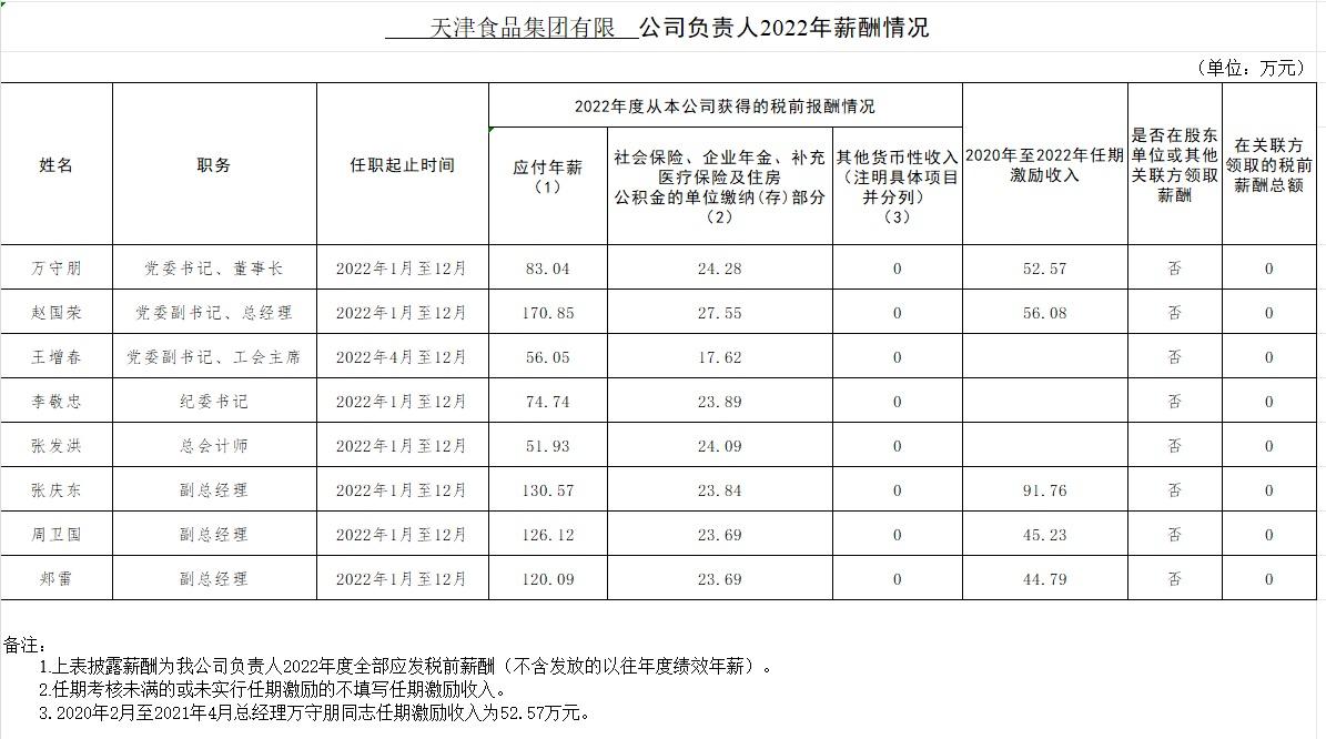 天津食品集團有限公司負責人2022年薪酬情況